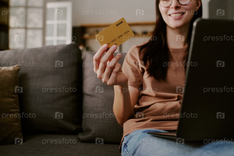 Молодая взрослая женщина держит кредитную карту, покупая онлайн дома