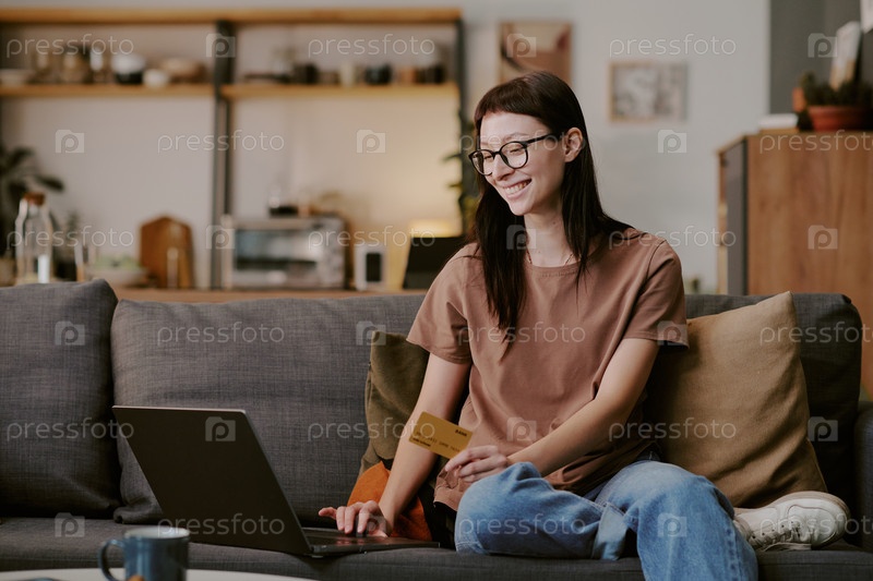 Молодая взрослая женщина покупает онлайн с помощью ноутбука и кредитной карты
