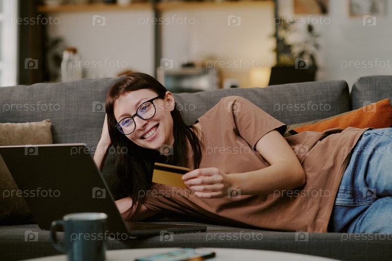 Молодая взрослая женщина, лежащая на диване Покупки онлайн с помощью кредитной карты