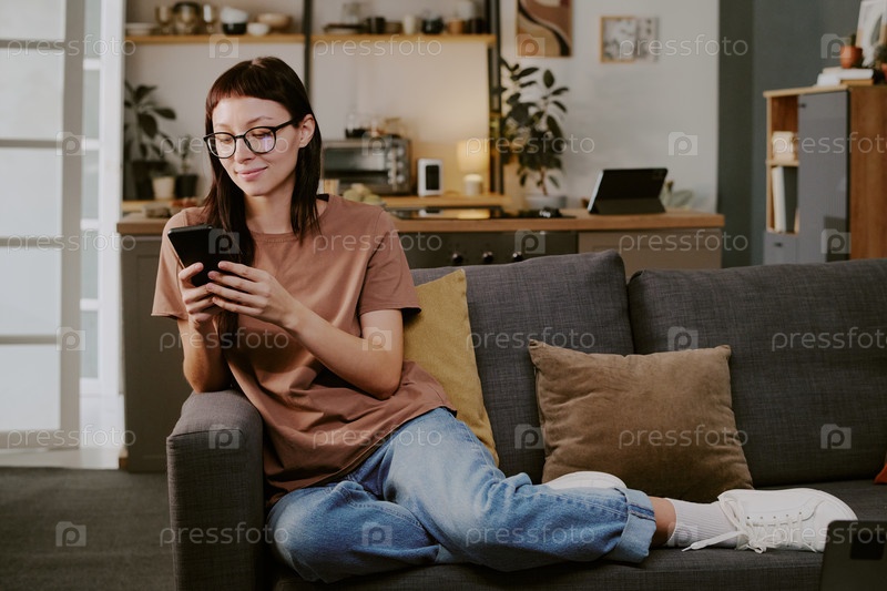 Молодая женщина, сидящая на диване с помощью смартфона для онлайн-покупок