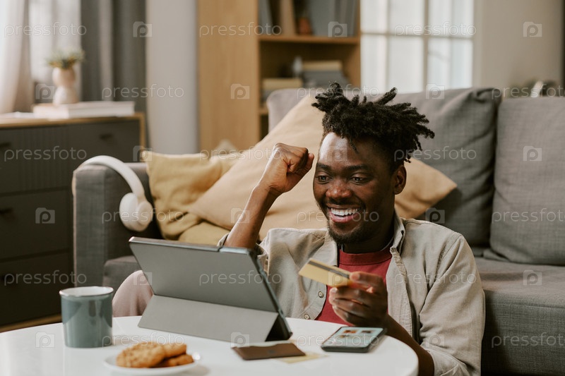 Молодой чернокожий мужчина празднует успешные онлайн-покупки с помощью кредитной карты в помещении