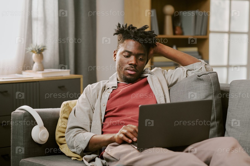 Молодой взрослый чернокожий мужчина отдыхает на диване, покупая онлайн с помощью ноутбука