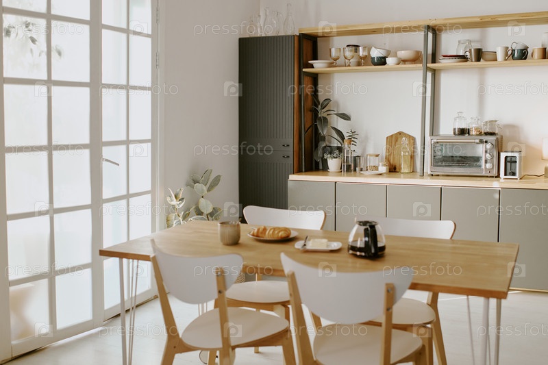 Пустой современный кухонный интерьер с деревянным столом и завтраком