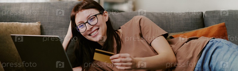 Header with Молодая взрослая женщина, лежащая на диване Покупки онлайн с помощью ноутбука