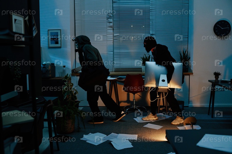 Два молодых взрослых мужчины воруют компьютерное оборудование во время ограбления офиса ночью
