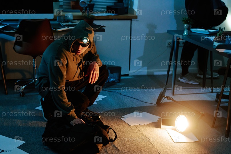 Молодой взрослый мужчина крадет документы в офисе во время ночного ограбления