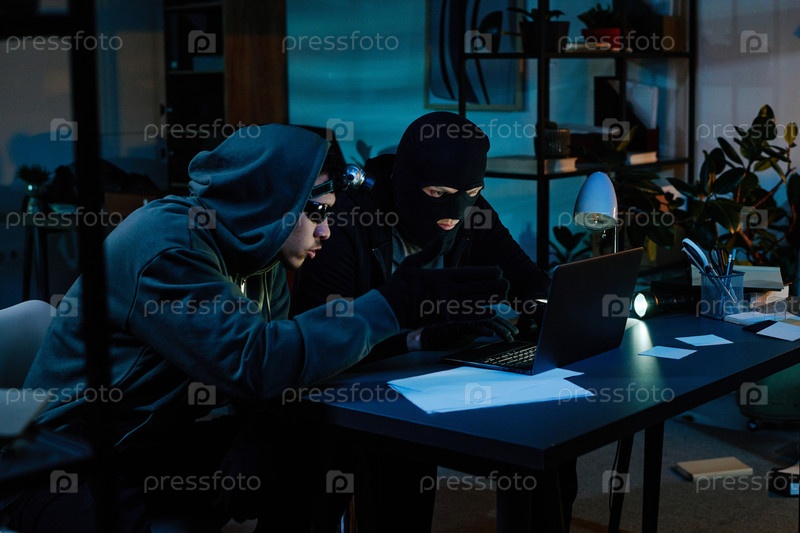 Два молодых взрослых мужчины, носящие маски, крадут данные с ноутбука в офисе ночью