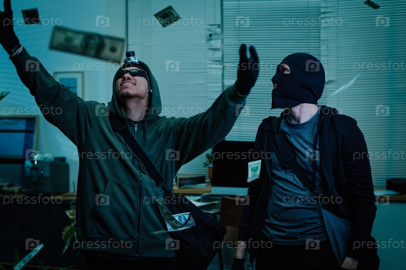 Молодые взрослые мужчины, носящие маски, воруют деньги внутри офисного здания
