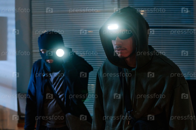 Молодые мужчины крадут офисное оборудование во время ночного ограбления