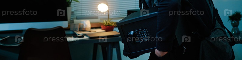 Заголовок с мужчиной среднего возраста, крадущим сейф из офиса ночью