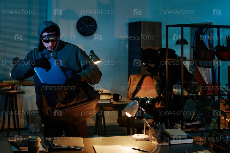 Два молодых мужчины воруют ноутбук и обыскивают офис во время ночного ограбления
