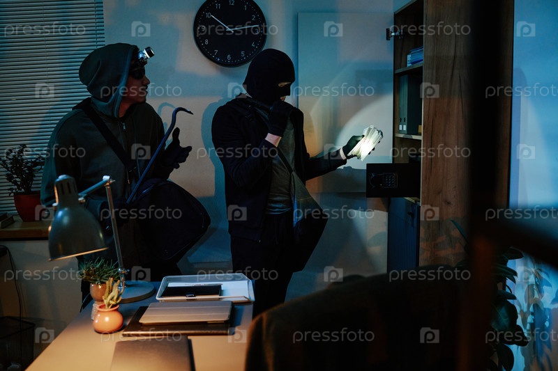 Два молодых взрослых мужчины воруют деньги из сейфа в офисе ночью