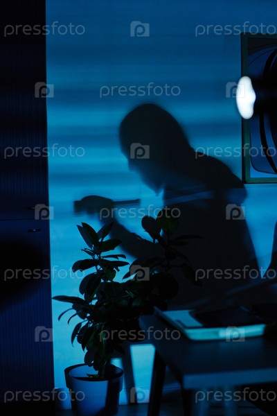 Силуэт молодого взрослого мужчины, который проникает в офис и крадет документы