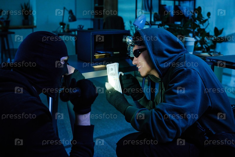 Молодые взрослые мужчины, носящие маски, проверяют наличные во время ограбления офиса