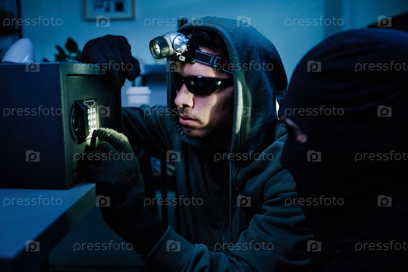 Молодой мужчина, носящий халат с капюшоном, ночью взламывает сейф в офисе