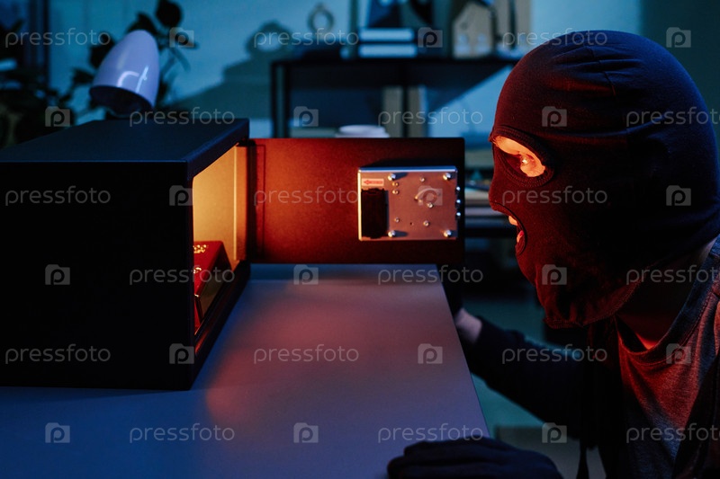 Маскированный молодой взрослый мужчина крадет драгоценности из сейфа в офисе ночью