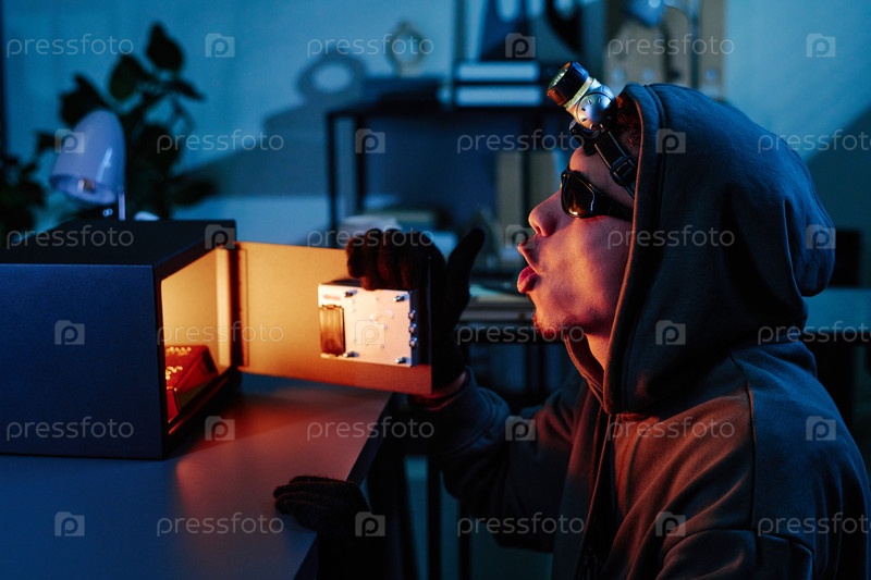 Молодой взрослый мужчина крадет драгоценности из сейфа в современной офисной обстановке