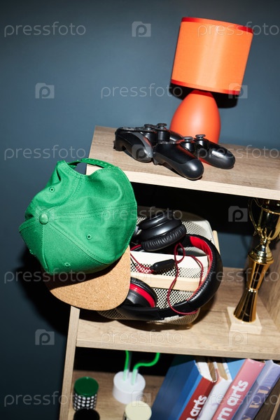 Игры подростков с наушниками и контроллерами на деревянной полке в спальне