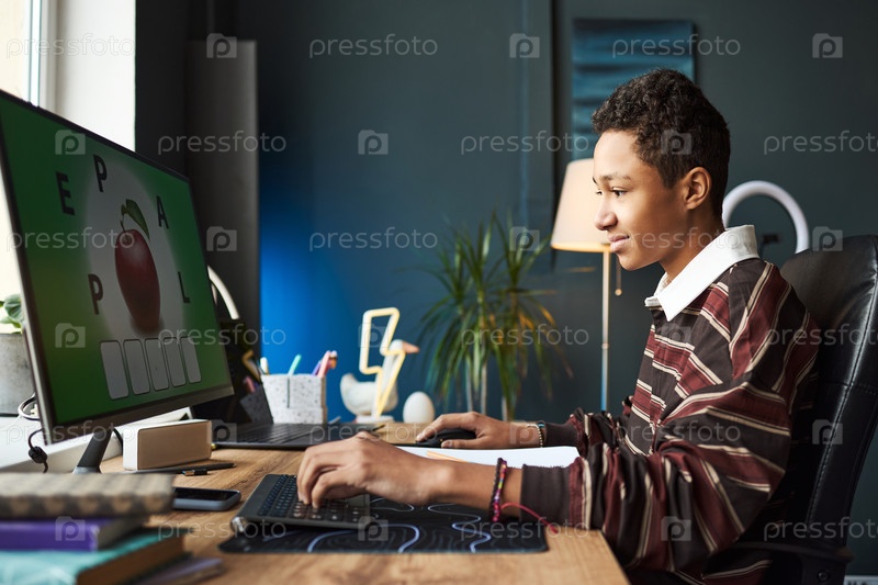 Чернокожий подросток использует компьютер для образовательной игры в современном домашнем офисе