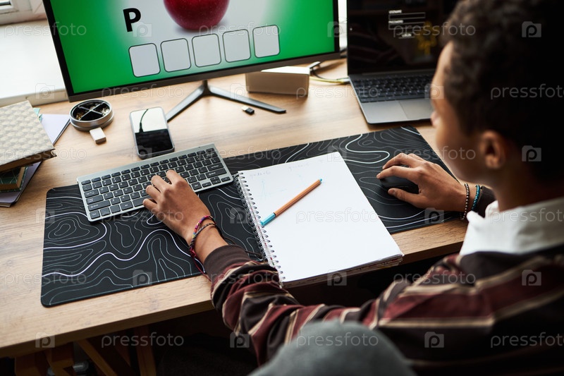 Мальчик-подросток, использующий компьютер для онлайн-обучения на рабочем столе