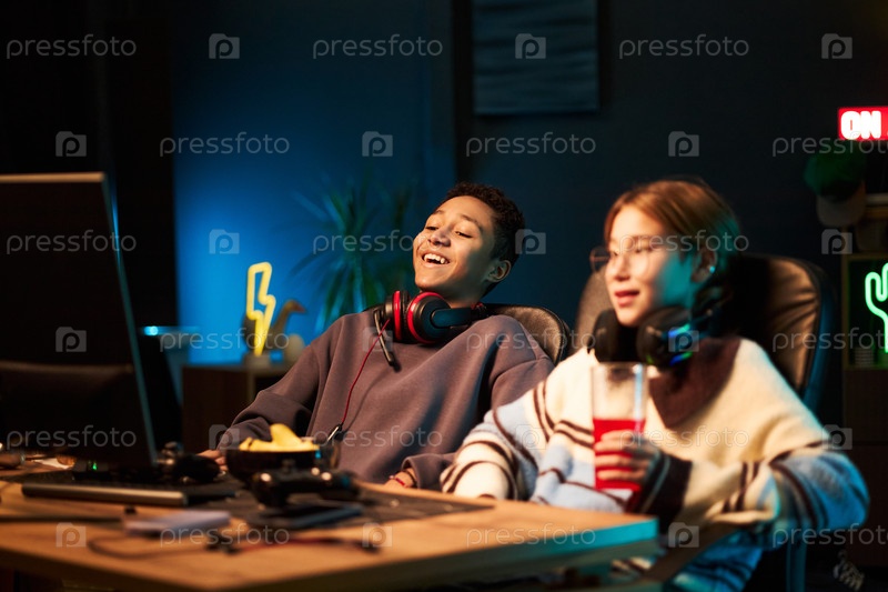 Многонациональные друзья-подростки играют в видеоигры вместе в уютной комнате