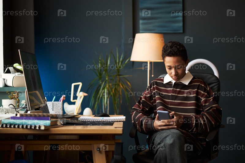 Чернокожий подросток сидит в помещении, используя смартфон на современном рабочем месте
