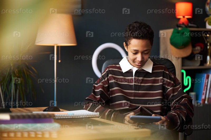 Чернокожий подросток сидит за рабочим столом, используя планшет в современном домашнем офисе