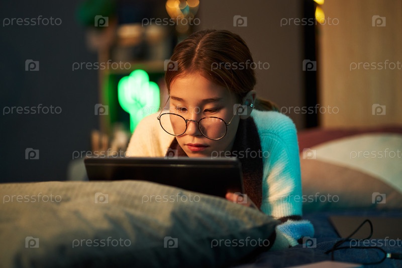 Портрет азиатской девочки-подростка, использующей цифровой планшет в постели