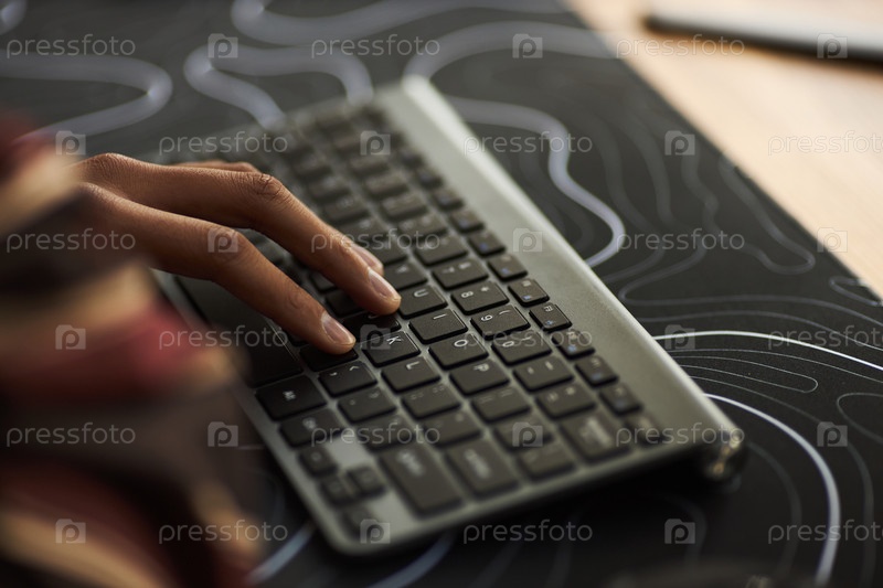Молодая взрослая чернокожая женщина печатает на беспроводной клавиатуре в современном рабочем пространстве