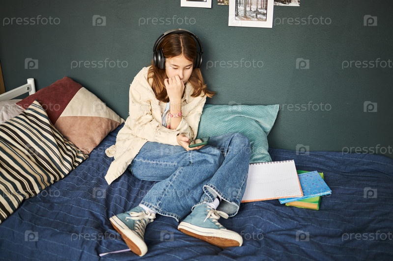 Девушка-подросток сидит на кровати и слушает музыку со смартфона