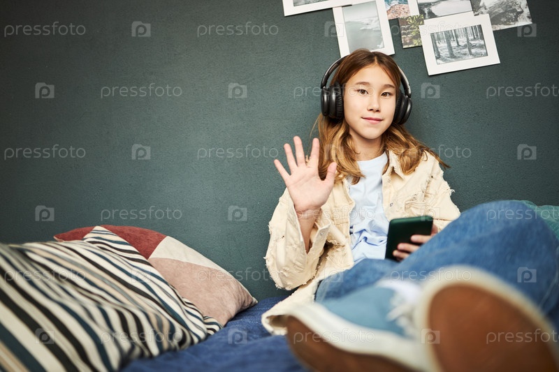 Портрет подростковой азиатской девушки, носящей наушники и размахивающей при использовании смартфона