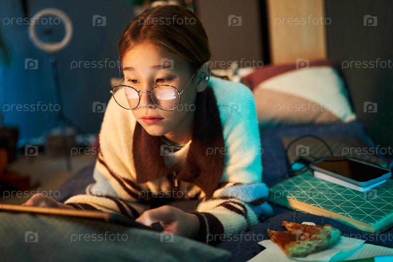 Юная азиатская девушка лежит на кровати с помощью планшета и учится в уютной комнате