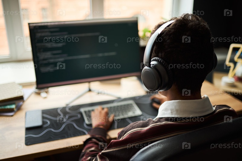 Молодой взрослый человек программирует на компьютере, нося наушники в офисе