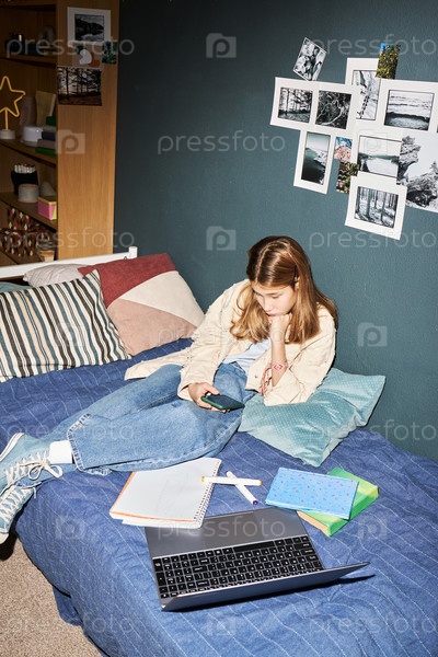 Девушка-подросток сидит на кровати, используя смартфон и учится удаленно