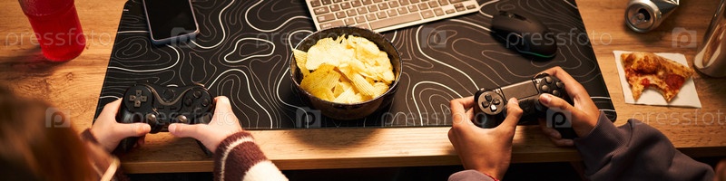 Подростковая девочка и чернокожий подросток играют в видеоигры и едят закуски