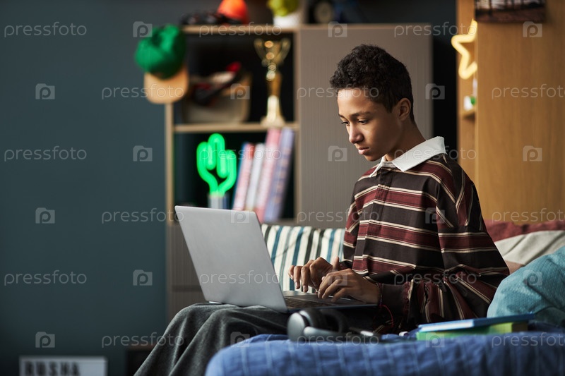 Чернокожий подросток сидит на кровати, используя ноутбук в спальне для учебы