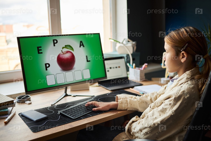 Девочка Ребенок решает словесную головоломку на компьютере во время онлайн-обучения