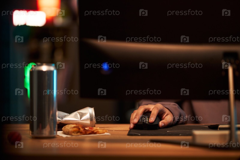Молодая взрослая женщина использует компьютерную мышь, едя пиццу за столом