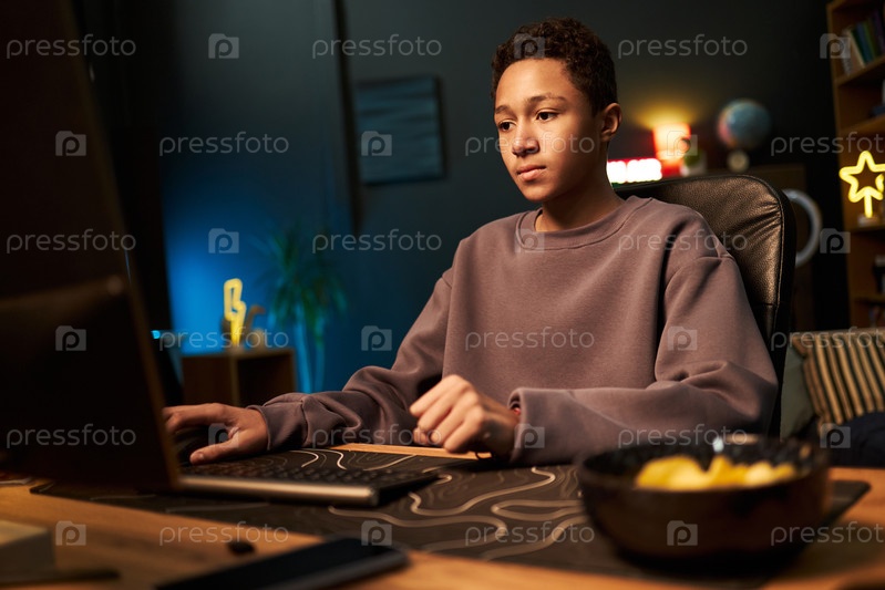 Подросток-бирациальный мальчик использует компьютер, сидя за столом в темной комнате