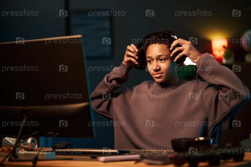 Чернокожий подросток носит наушники, играя на компьютере ночью