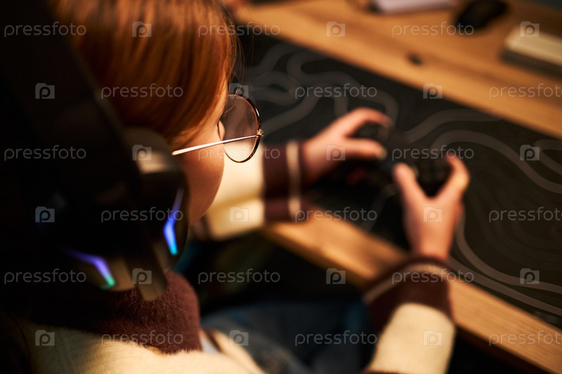 Девушка-подросток, которая носит наушники и играет в видеоигры внутри дома