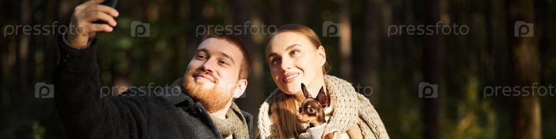 Молодой мужчина и женщина делают селфи на открытом воздухе с маленькой собачкой