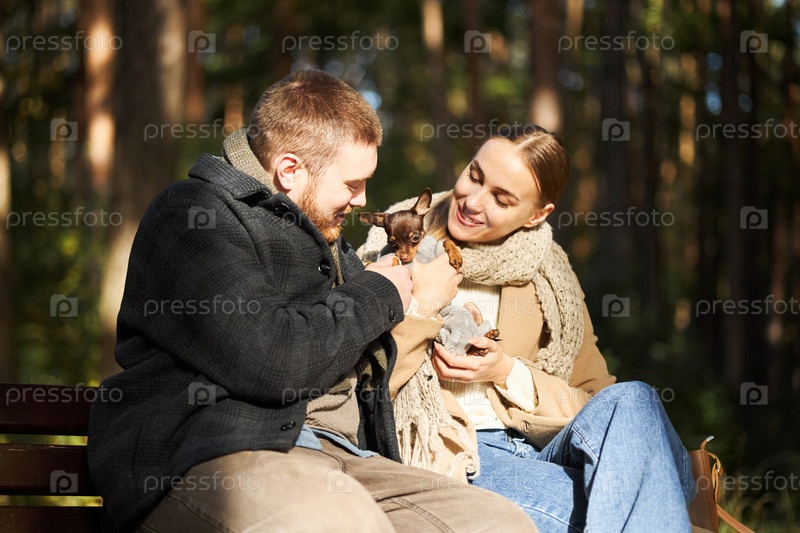 Молодой мужчина и женщина сидят на улице, держа маленькую собаку вместе