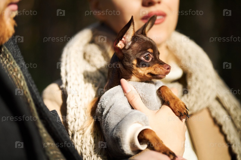 Молодая женщина держит маленькую собаку на открытом воздухе с мужчиной, стоящим рядом