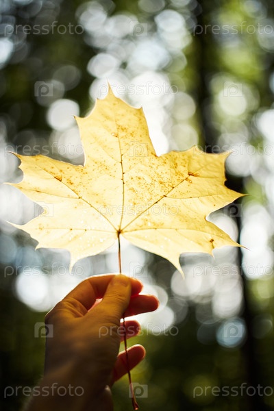 Рука, держащая кленовый лист против солнечного света на открытом воздухе Мужчина