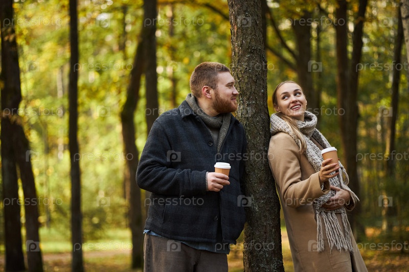 Молодой мужчина и молодая женщина улыбаются и пьют кофе в осеннем лесу