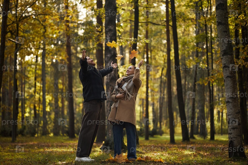 Любящая пара наслаждается осенними листьями в лесу на открытом воздухе