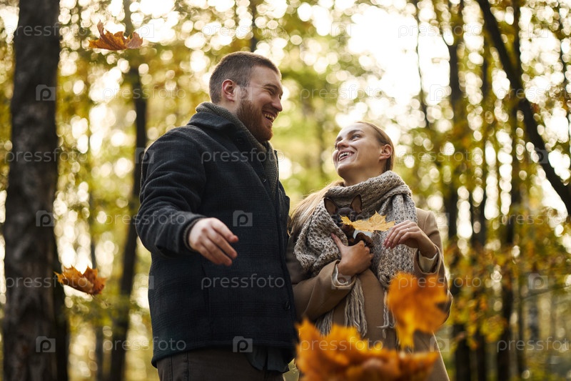Молодая взрослая пара смеется вместе во время прогулки по осеннему лесу