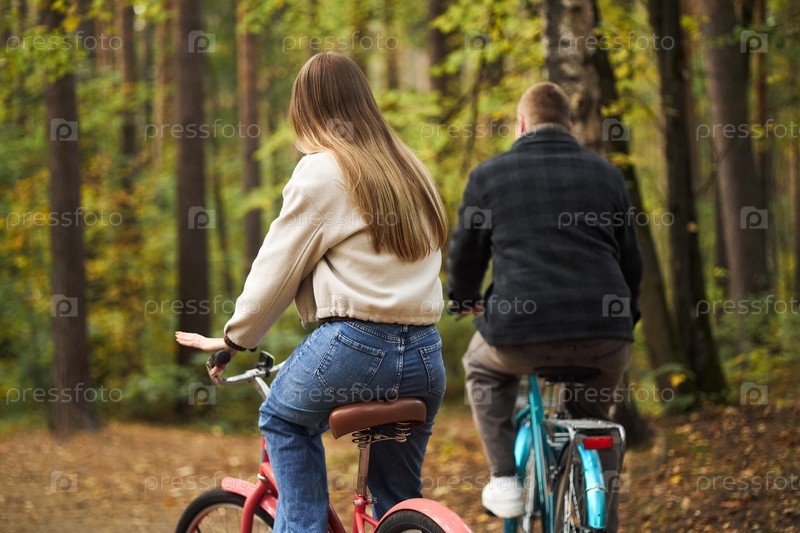 Молодая женщина и молодой человек едут на велосипедах в лесу