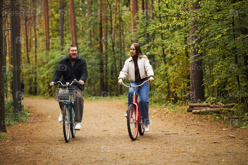 Молодой мужчина и женщина едут на велосипедах вместе в Осеннем лесу